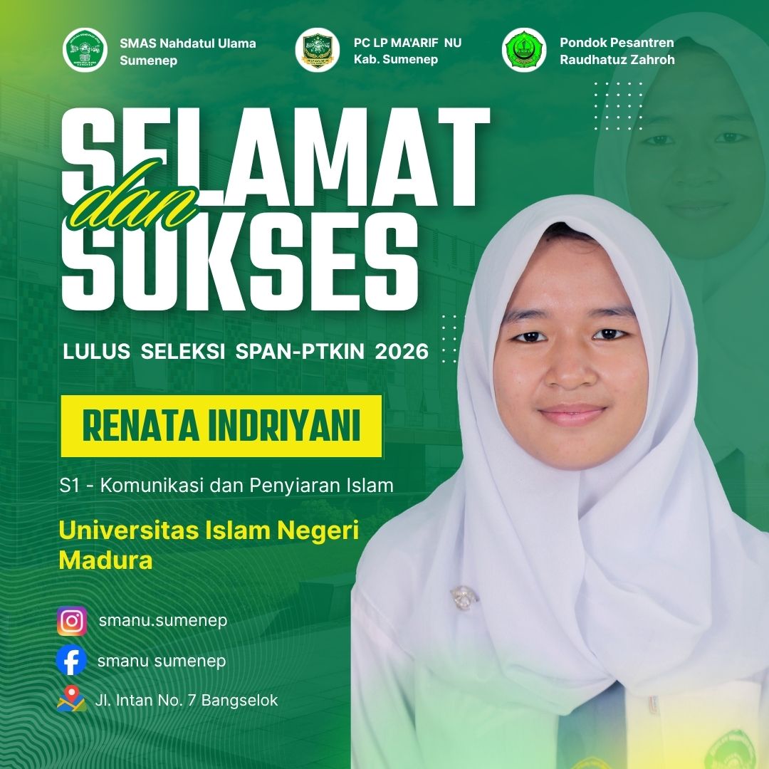 Salah satu siswi kelas Fase XII-F1, Renata Indriyani, berhasil lulus Seleksi Prestasi Akademik Nasional Perguruan Tinggi Keagamaan Islam Negeri (SPAN-PTKIN) tahun 2026.