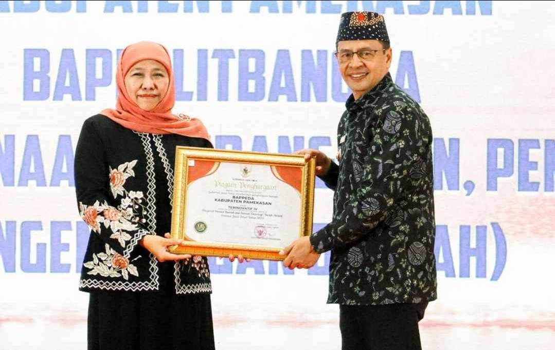 Pj Bupati Pamekasan saat menerima penghargaan dari Pemprov Jatim yang diberikan langsung oleh Gubernur Jatim Khofifah Indar Parawansa.